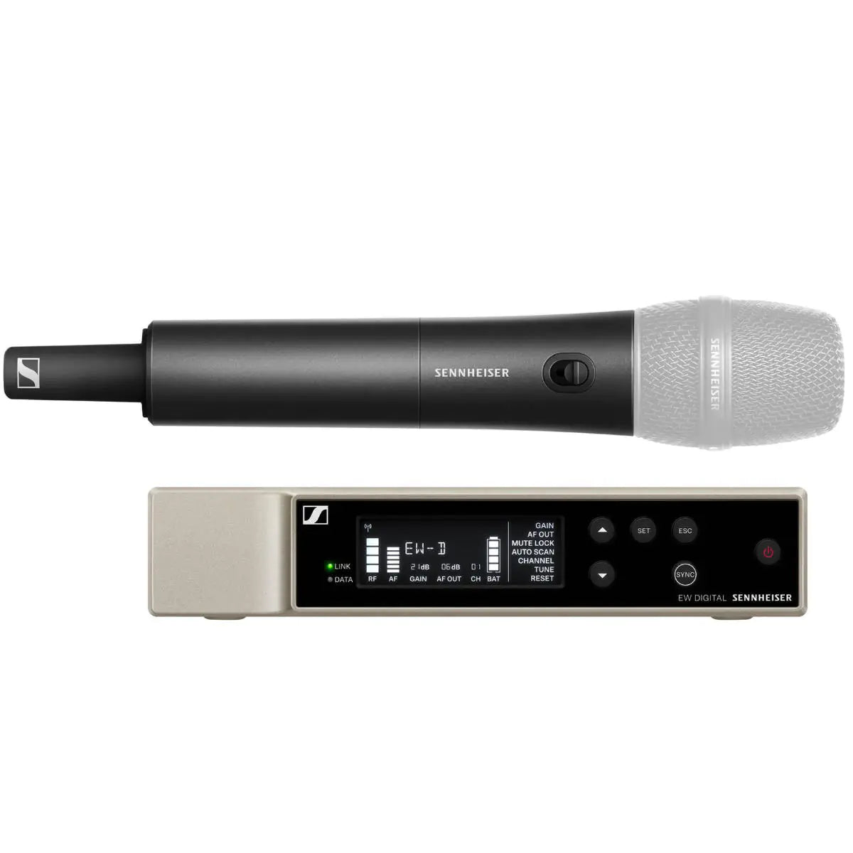 The EW-D EM receiver is housed in a rugged, half-rack metal chassis, suitable for both tabletop use and professional rack mounting. It features a high-contrast OLED display for easy navigation in low-light environments. The EW-D SKM-S handheld transmitter is also built with a durable metal housing and includes a dedicated mute switch for user control on stage.